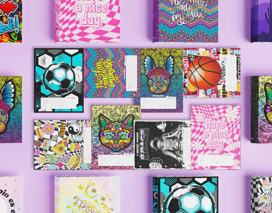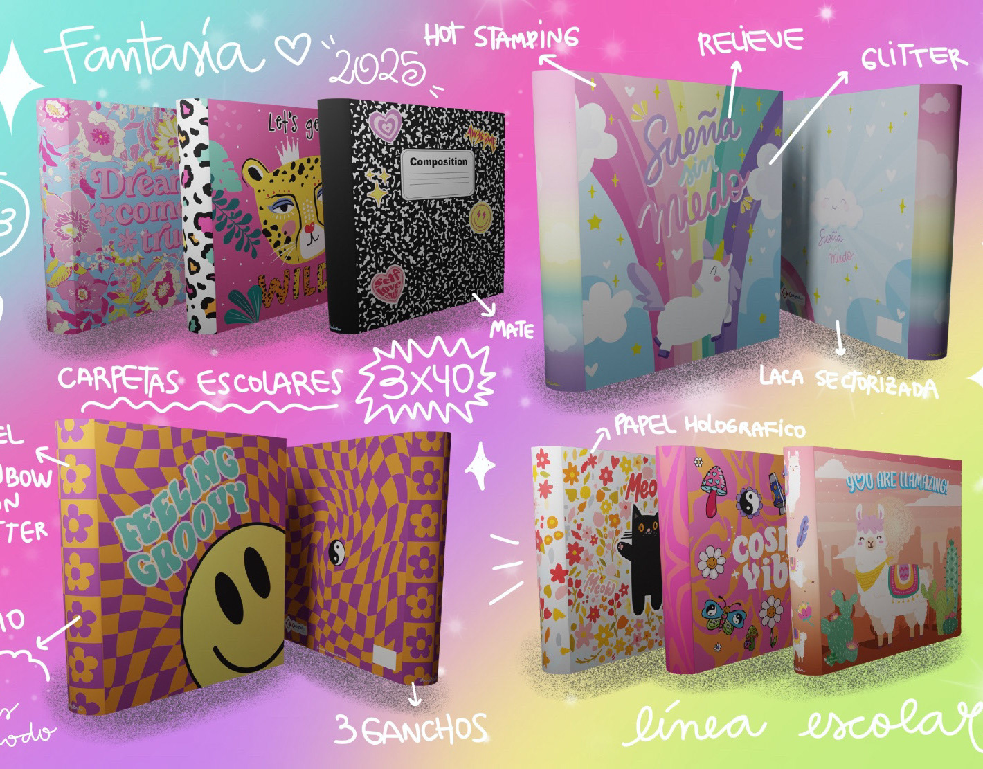Diseño y desarrollo de línea fantasía para carpetas escolares , formato 3x40 (3 ganchos) con acabados en relieve, hot stamping, glitter y laca uv.